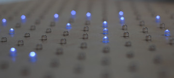 I use four Max7221 Display Controllers for 256 LEDs in a 16x16 matrix pattern. The Max7219 is almost identical and slightly cheaper for this kind of application. These ICs are awesome because they take a lot of work off the microcontroller and, more importantly, the wiring and logic design. You can daisy-chain up to eight (or even more) of them to theoretically make a display twice as big as this. The interface takes up only three output pins on the Arduino. They were meant for driving eight seven segment displays each but can be configured with custom patterns instead – giving eight rows and columns. Data is shifted through the devices on the common clock, each contains a 16 bit shift register from which the address (one matrix row or special function) and data (a control value or on/off information for each LED in the row) is read on the Load signal. The data for each row is stored in internal registers, and then they operate by the persistence of vision principle. That is, each row of the matrix is flashed in turn, so fast that we think they’re all on at the same time. This allows them to connect to 64 LEDs with only 16 wires. Again, if in doubt have a look at the data sheet – it’s very helpful.
