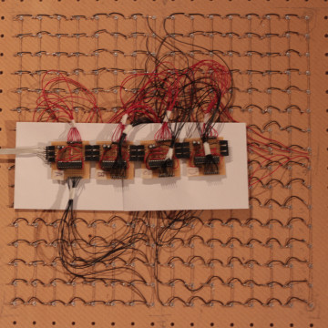 The only additional components are two decoupling capacitors (10µF and 0.1µF) and a single current limiting resistor for the LEDs. The resistor is defined by the LEDs’ forward voltage and current, as described in a table in the datasheet. I built the four control units on separate boards: They’re connected by a five line bus, sending the data out (DOUT) from the first chip to the data in (DIN) of the next one and so on, as well as providing the common bus clock, load signal and the power supply to all units.